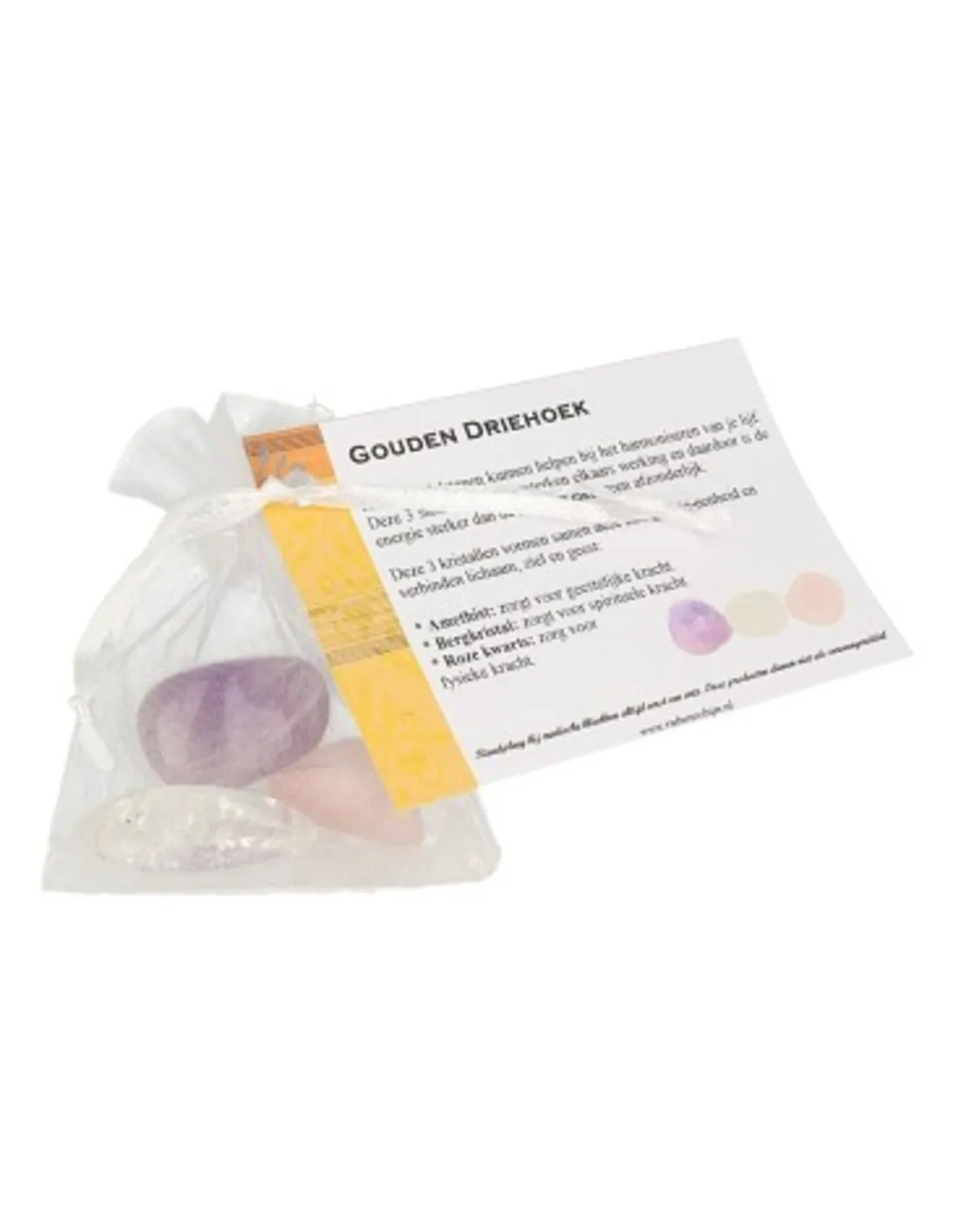 Buideltje met daarin de gouden driehoek in half-edelstenen, ook wel ‘heilige drie-eenheid’ genoemd, bestaande uit Amethist, Bergkristal en Roze kwarts.